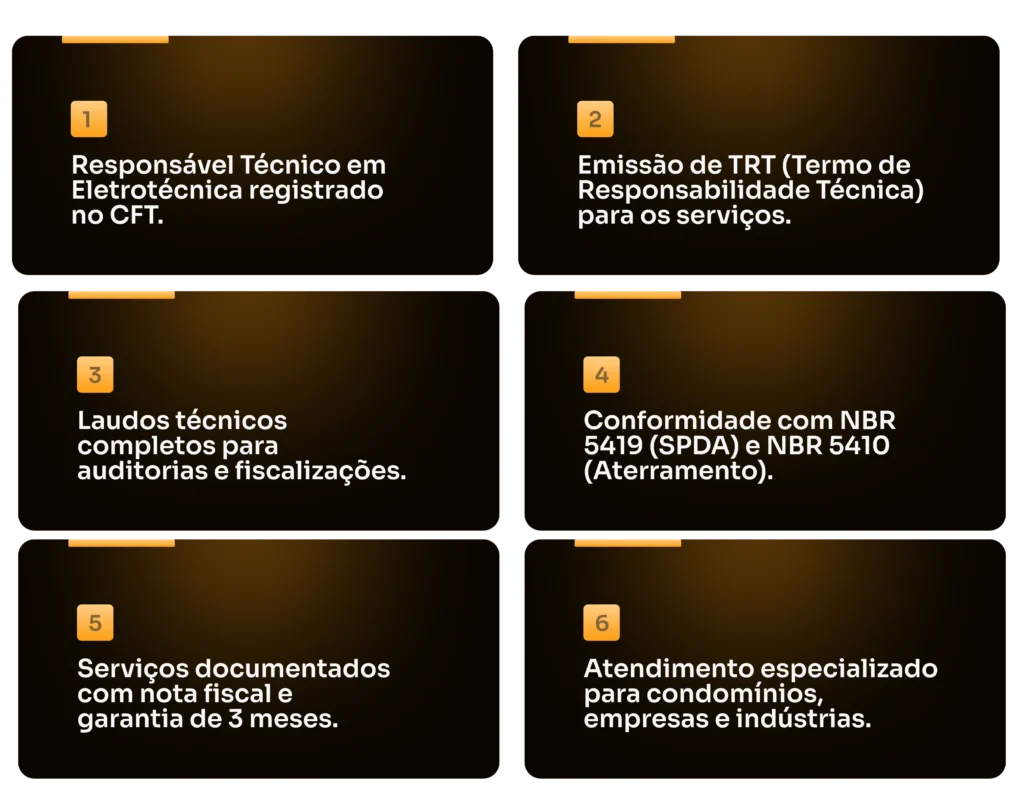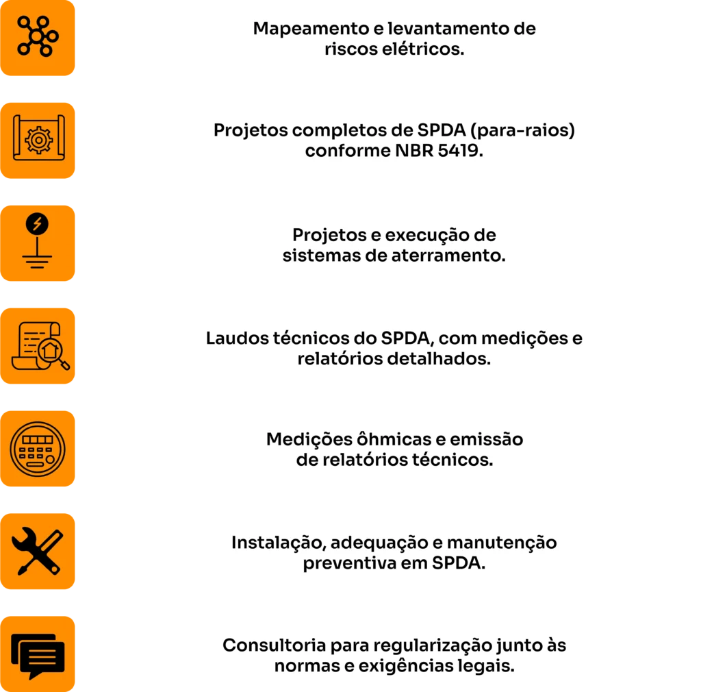 Não arrisque a segurança do seu patrimônio. Fazemos laudos técnicos, análise de riscos, projetos e execução completa em SPDA e aterramento, tudo conforme normas vigentes e com garantia de qualidade.